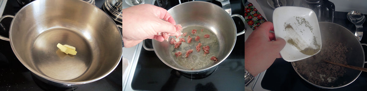 I melted butter in a saucepan over medium high heat. I crumbled breakfast sausage into the pan. I used my OFG Breakfast Sausage but you can use any commercial breakfast sausage as well. You can buy it in bulk or squeeze it out of the casings of link sausage.