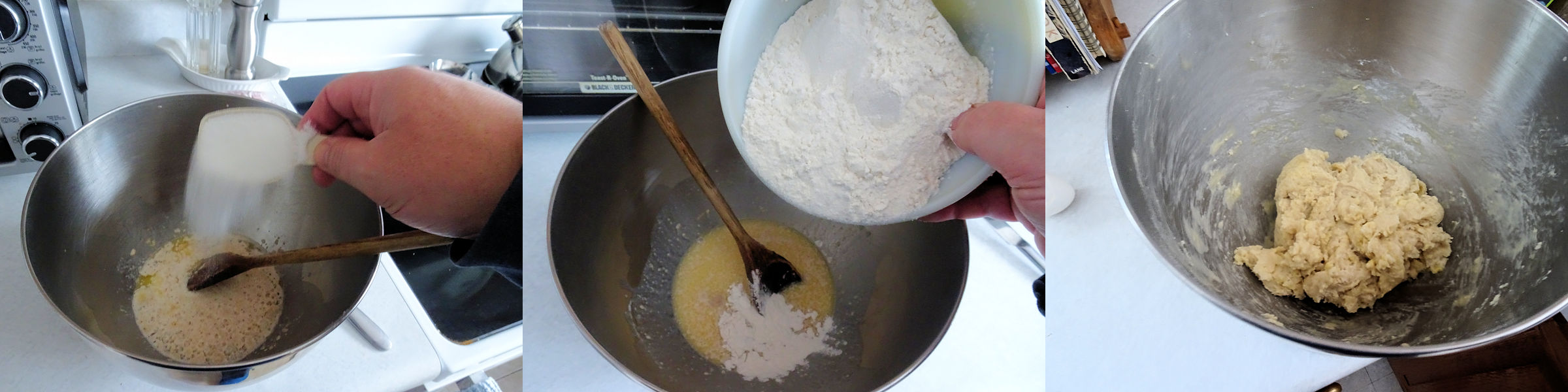4. Add 415 ml (1 3/4 cup) all-purpose flour to the mixture and stir until it comes together in a rough ball.