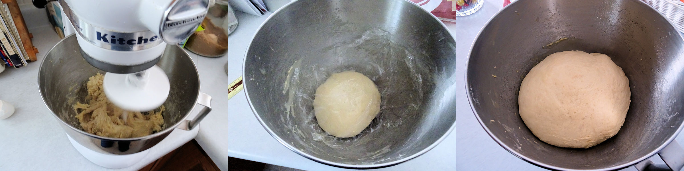 6. Grease a bowl with baking spray. Put the dough in and turn it. Cover the ball with plastic wrap and let it sit in a warm place until doubled, about one hour.