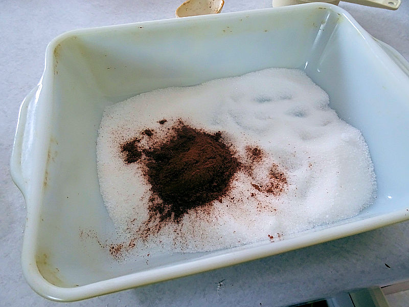 13. While the donuts are rising you can mix a cinnamon sugar coating. Mix 75 ml (1/3 cup sugar) with 10 ml (2 tsp) cinnamon.