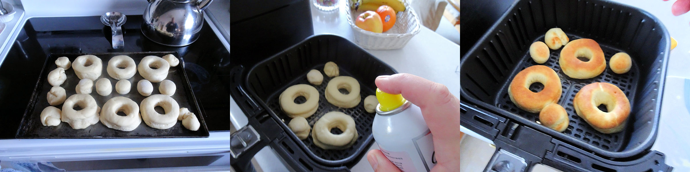14. Preheat the air fryer to 350 F (175 C). Spray the basket with baking spray. Put donuts and holes in the basket without letting them touch. Spray the donuts with baking spray.