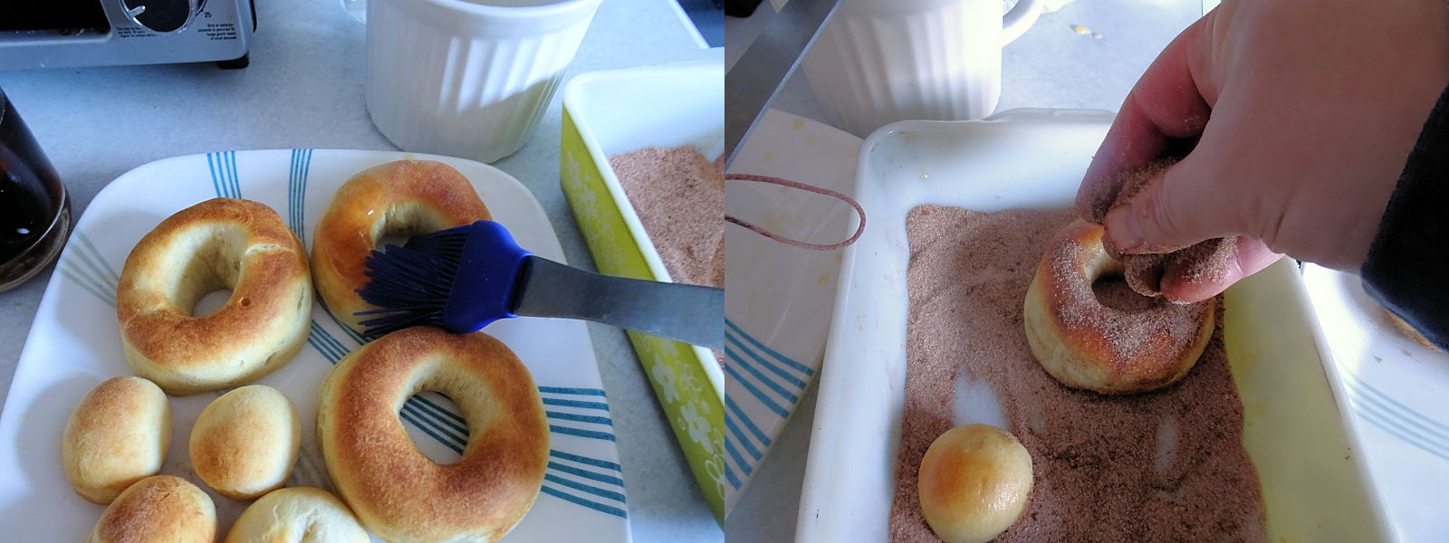 While the donuts are rising you can mix a cinnamon sugar coating. Mix 75 ml (1/3 cup sugar) with 10 ml (2 tsp) cinnamon.