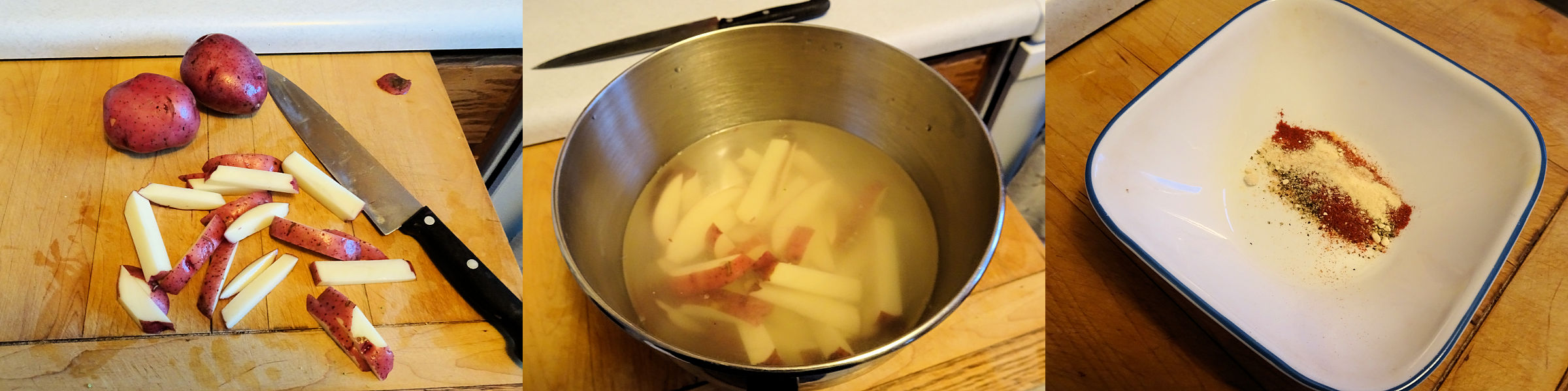 - Cut 4 medium potatoes into 1/2 inch (1 cm) thick fries. I didn't peel them. A lot of the flavour and nutrients are in the skin.