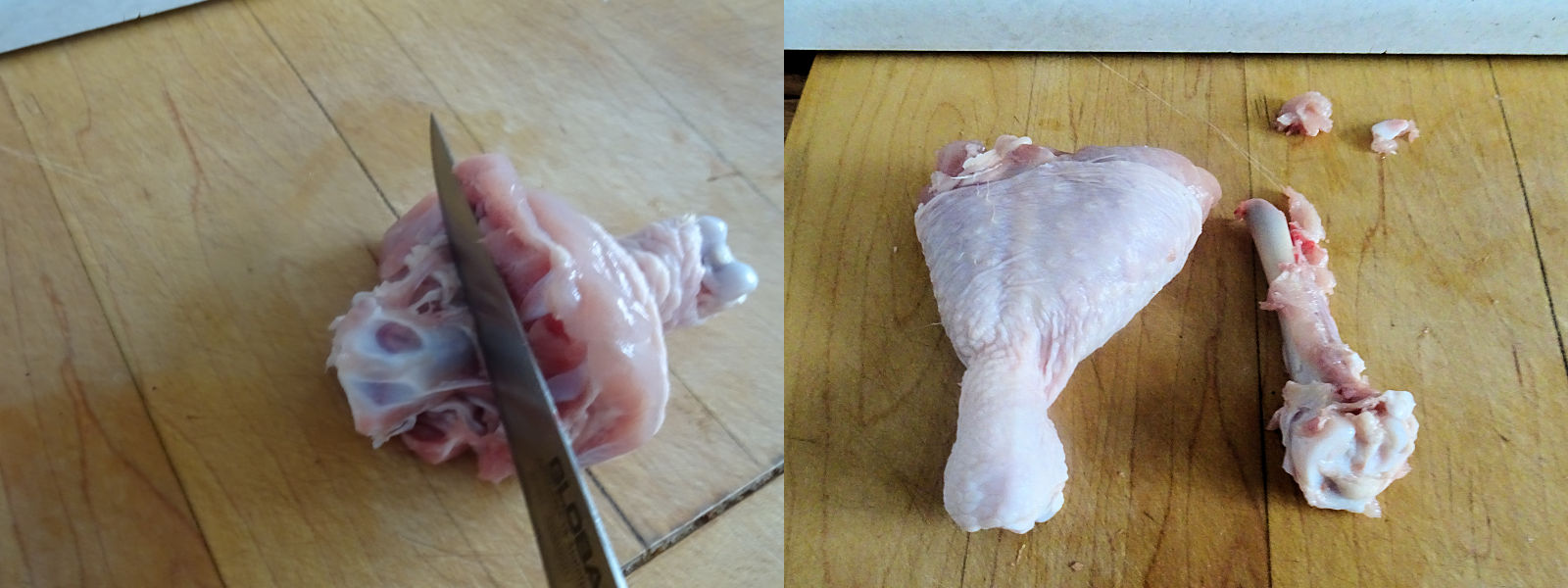 Put a drumstick on a cutting board and hit just above the knuckle at the end of the drumstick with the dull side of a large chef’s knife. You are looking to break the bone just above the knuckle.