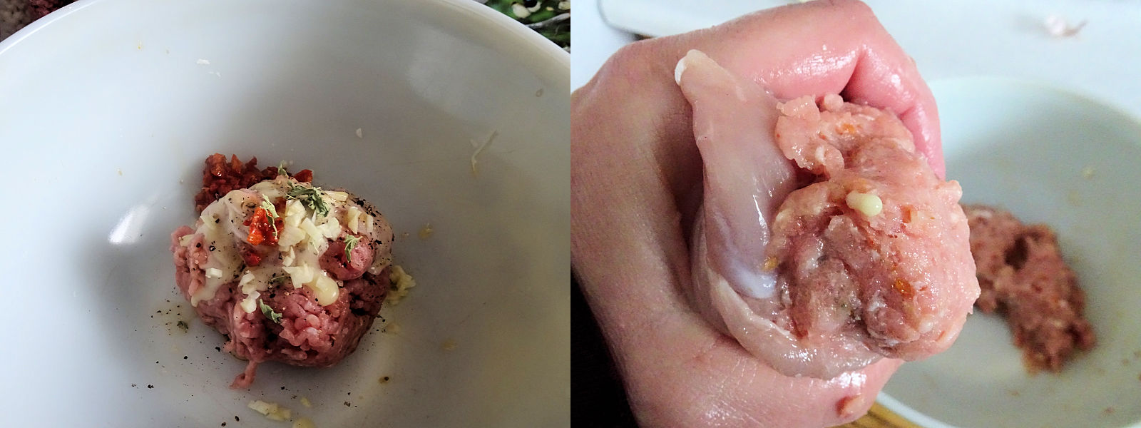 - Prepare the stuffing mixture. Mix together: the ground chicken, butter, garlic, Worcestershire sauce, pepper, sundried tomatoes, oil from the tomatoes, and dried oregano.