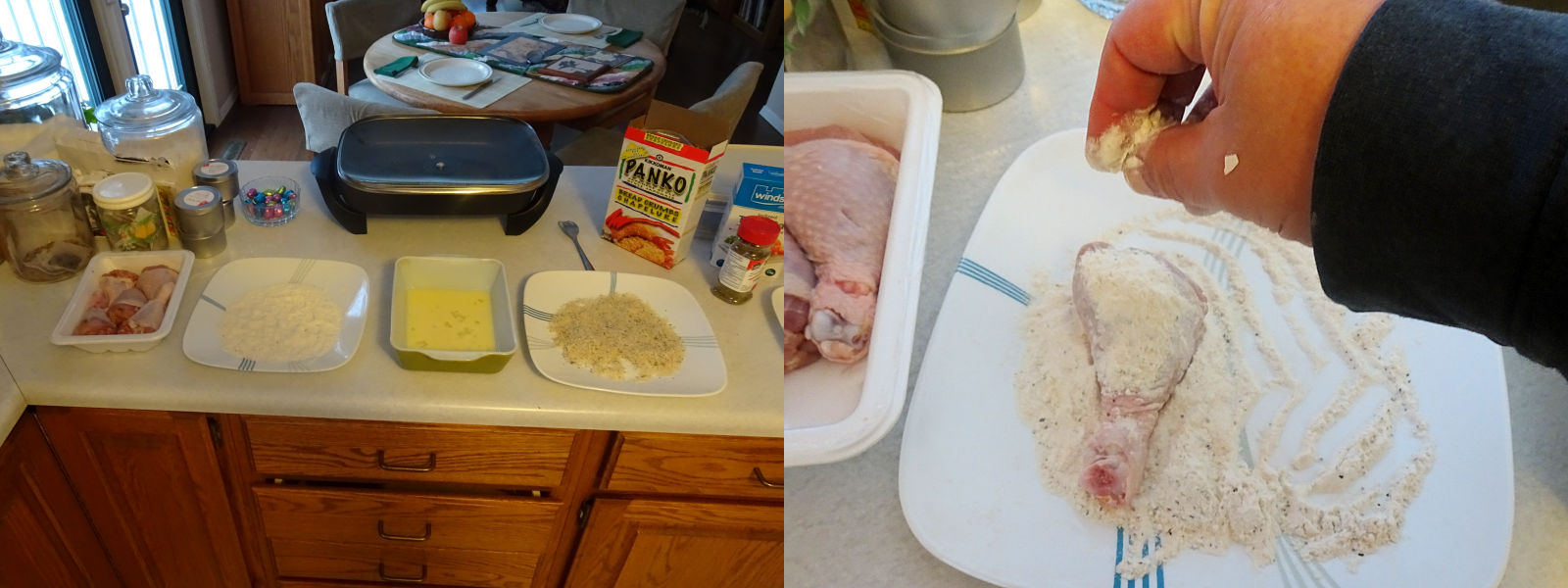 - Put a chicken drumstick on the flour with your right hand. Shovel flour over the drumstick to coat.Â