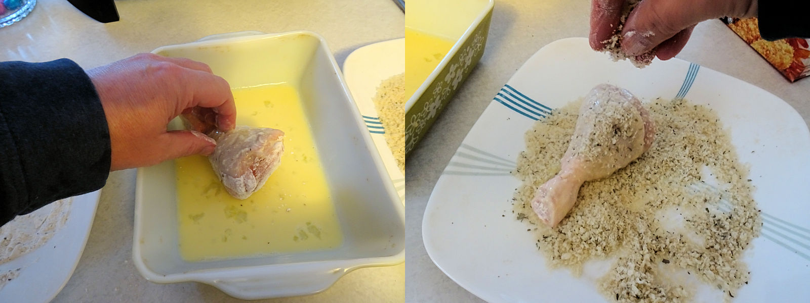 Put it in the egg mixture with your left hand and turn to coat. Lift it out of the egg mixture onto the breadcrumbs with your left hand. Use your right hand to shovel breadcrumbs over it and put it on a plate.