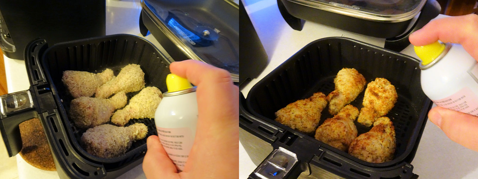 Preheat your air fryer to 380 F (195 C). Spray the basket with baking spray. Put the drumsticks in the basket so they don’t touch. Spray the drumsticks with baking spray.