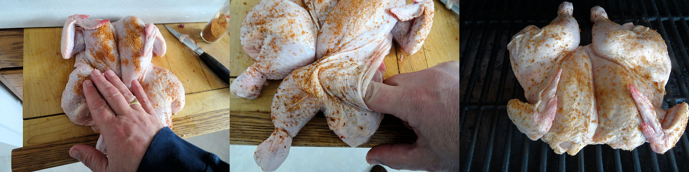 I worked some Memphis Rub under the skin of the thighs and breast with my finger by carefully working my finger under the skin and then pushing the seasoning in. You could also use any barbecue rub you like on chicken. Give the skin a good coating of the rub.