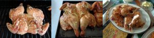 I started with a three pound chicken. I spatchcocked (stop sniggering, it isn’t dirty) the bird. This involves cutting the backbone and breast bone out so the chicken lays flat. There is a video in my Rosemary Chicken post that illustrates the method. I like to spatchcock as I find the bird cooks more evenly.