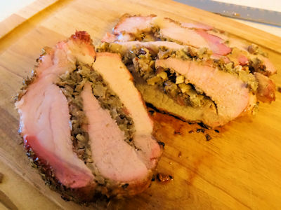 This turned out very well. The duxelle filling had a rich taste with nice bacon overtones. The pork was moist and had picked up flavour from the onion and herbs.