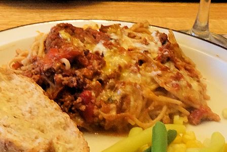 I ordered baked spaghetti at an Italian restaurant recently. It was spaghetti tossed with Bolognese sauce, some cheese sprinkled over the top and broiled. It was OK but I was sure I could do better. Here is my effort.