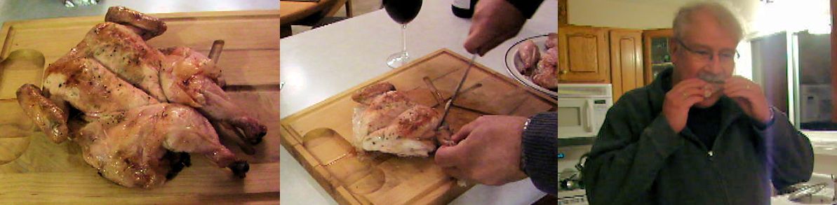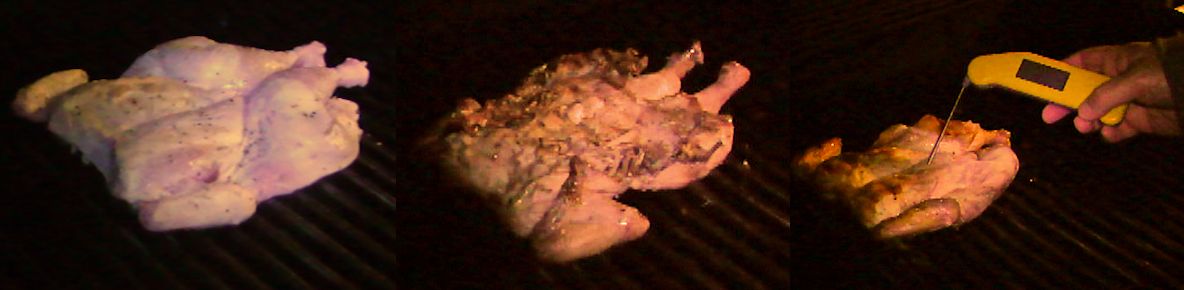 I then set up my barbecue for indirect cooking . That means I had some burners turned on and others turned off and I will cook over the burner that is turned off. I adjusted my burners until the temperature inside my barbecue was 300 to 350 F. I put the chicken on the barbecue breast side up, closed the lid and cooked for 40 minutes. Then I turned the breast side down for 20 minutes. I turned the bird over and made sure the internal temperature of the breast and thighs was at least 165 F. If not, continue cooking until it is.
