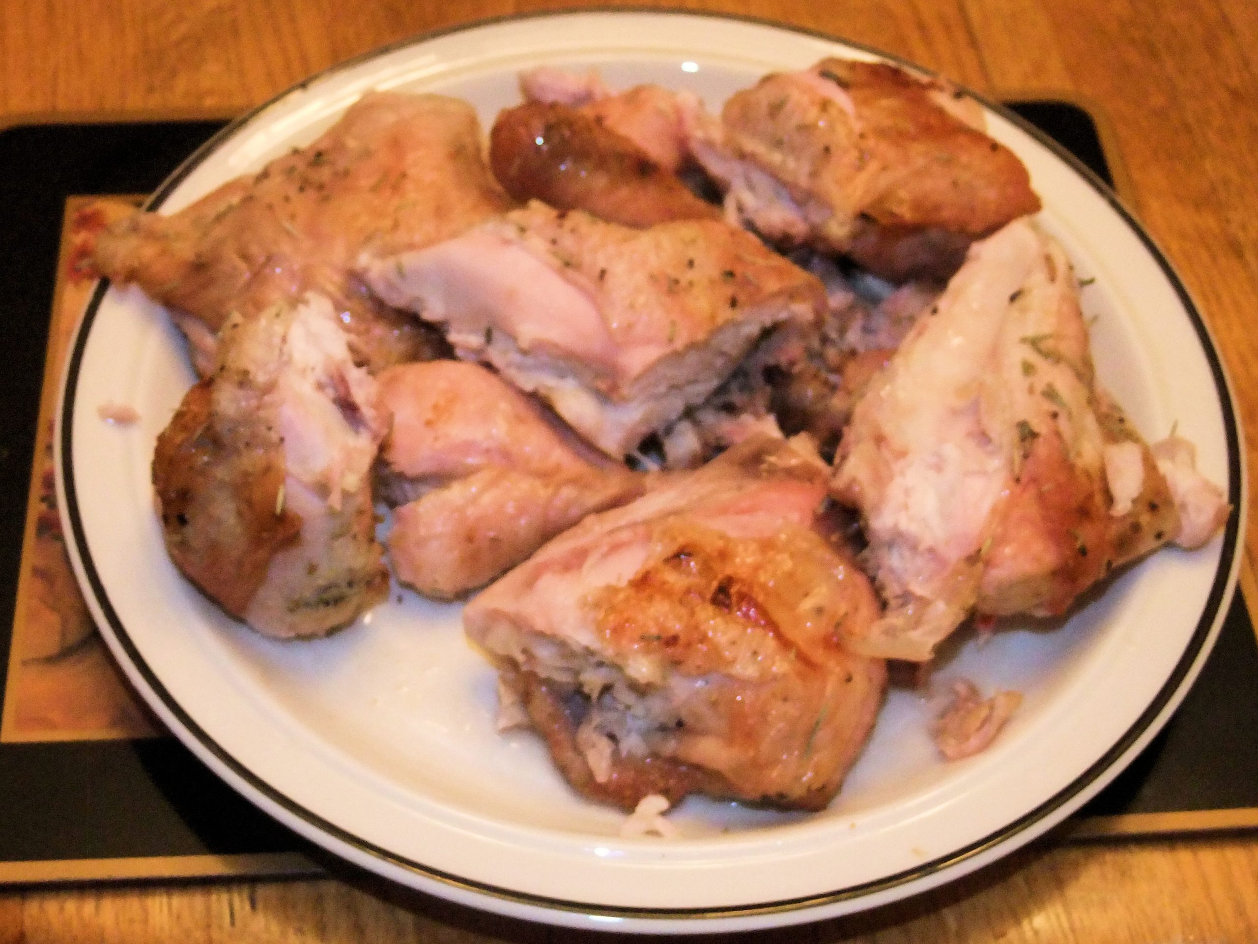I then covered the chicken with foil and let it sit for 10 minutes. I cut the chicken into pieces and ate. It was so juicy that it sprayed on my sweater as I bit into the drumstick!