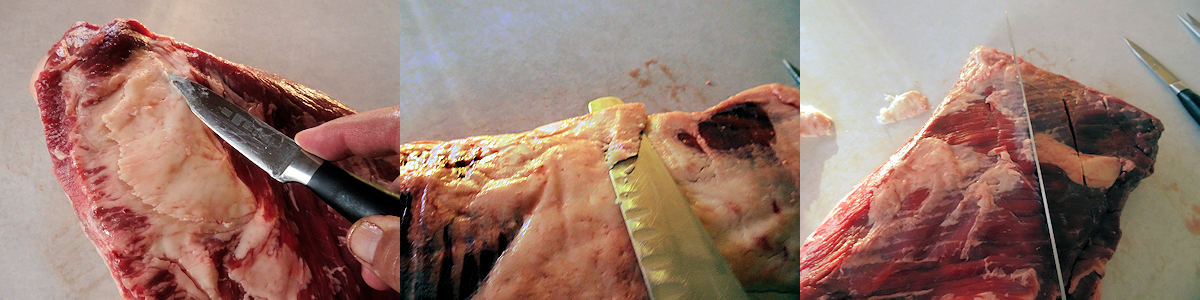 - Cut a 3/4 inch deep slice all around the fat line separating the point from the flat.