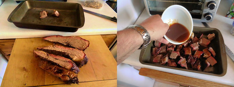 Cut the point into 1 inch cubes and put them in a roasting pan. Sprinkle with the 10 ml (2 teaspoons) of rub you reserved and toss. Mix the 125 ml (1/2 cup) of juices with 125 ml (1/2 cup) barbecue sauce. If you didn’t have enough juices, top them up with beef stock.