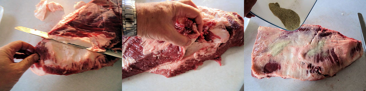 - Cut 1/4 inch deep slices across the grain on the flat so will know which way to cut when it is cooked.