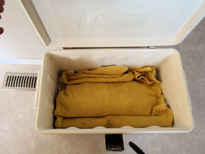 Bring the brisket in. If it is more than two hours until dinner, Put some old towels in the bottom of a cooler and put the brisket in a pan on them. Cover with more towels and close the cooler.