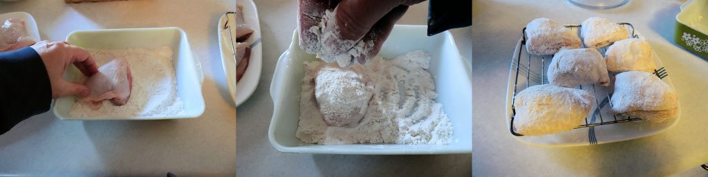 - With one hand, put a piece of chicken in the flour. With the other hand, scoop the flour over the chicken.