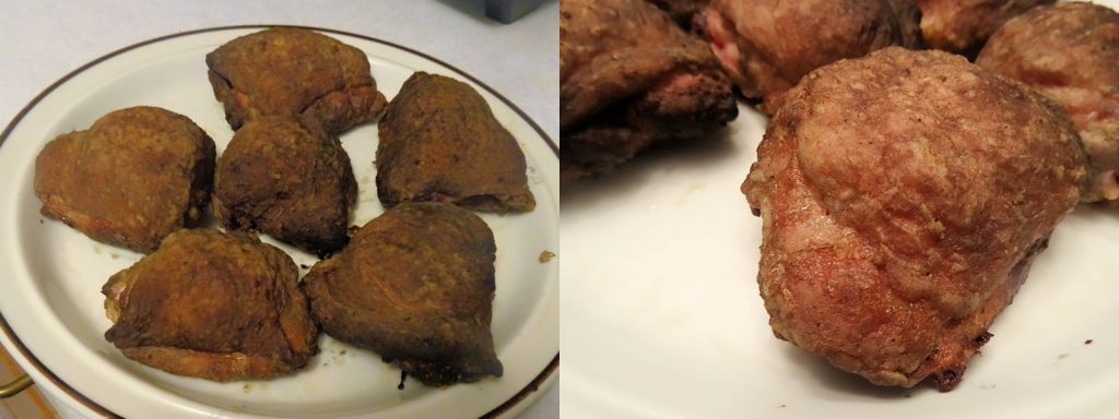 - Take the thighs from the brine mixture and put it on a plate. Do not dry or shake off excess liquid.