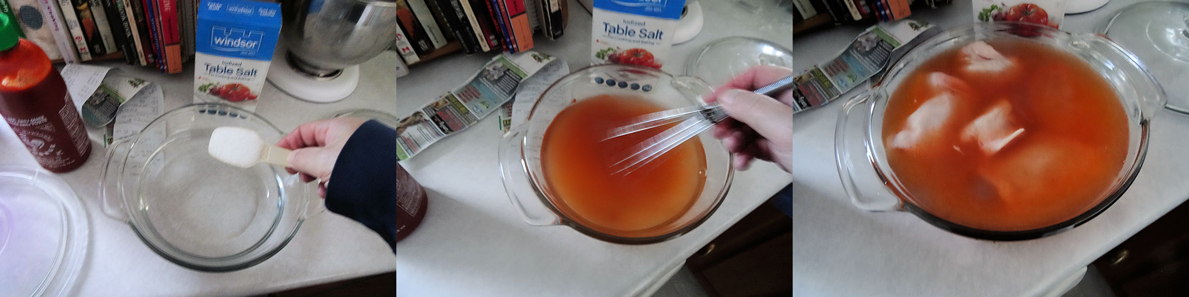 - Mix water, Sriracha, 15 ml (1 tablespoon) salt and sugar to dissolve.