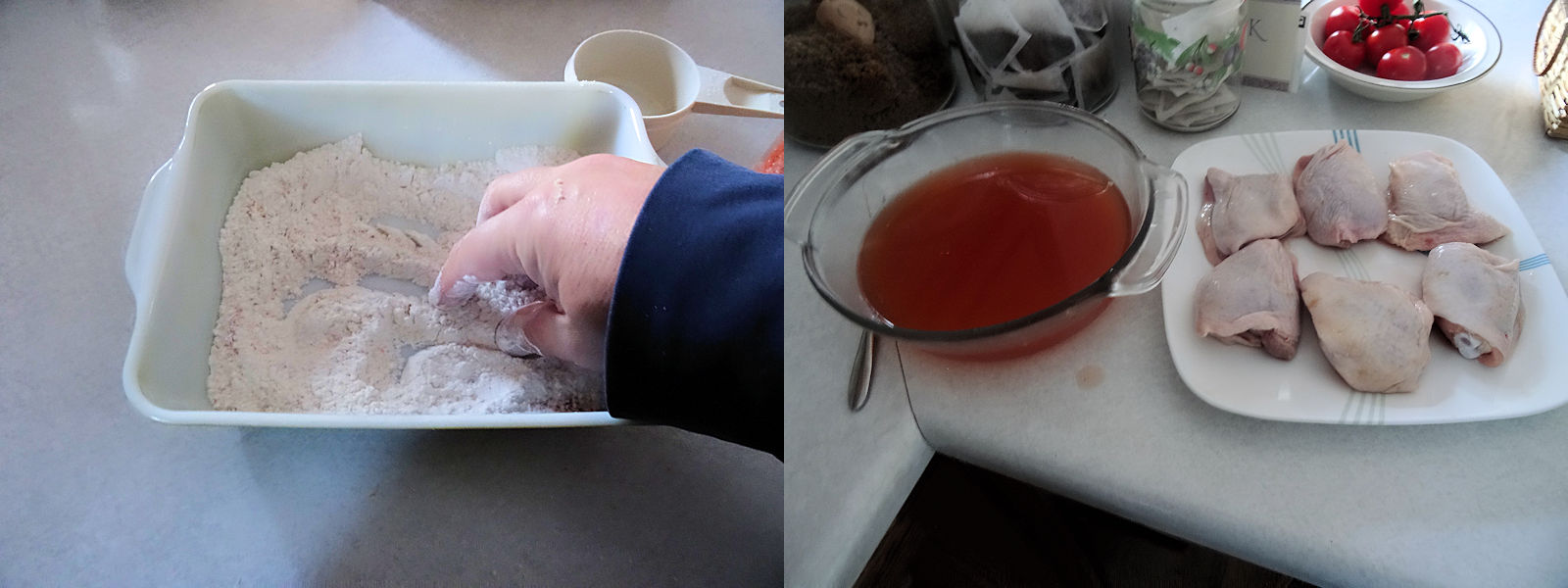 - With one hand, put a piece of chicken in the flour. With the other hand, scoop the flour over the chicken.