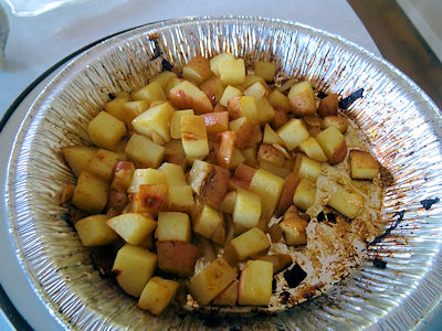 - Put potatoes, onion and garlic in an aluminum pie plate.