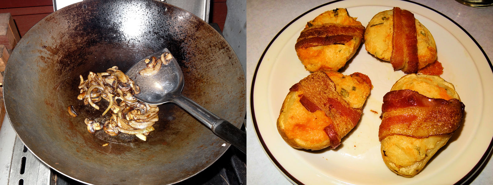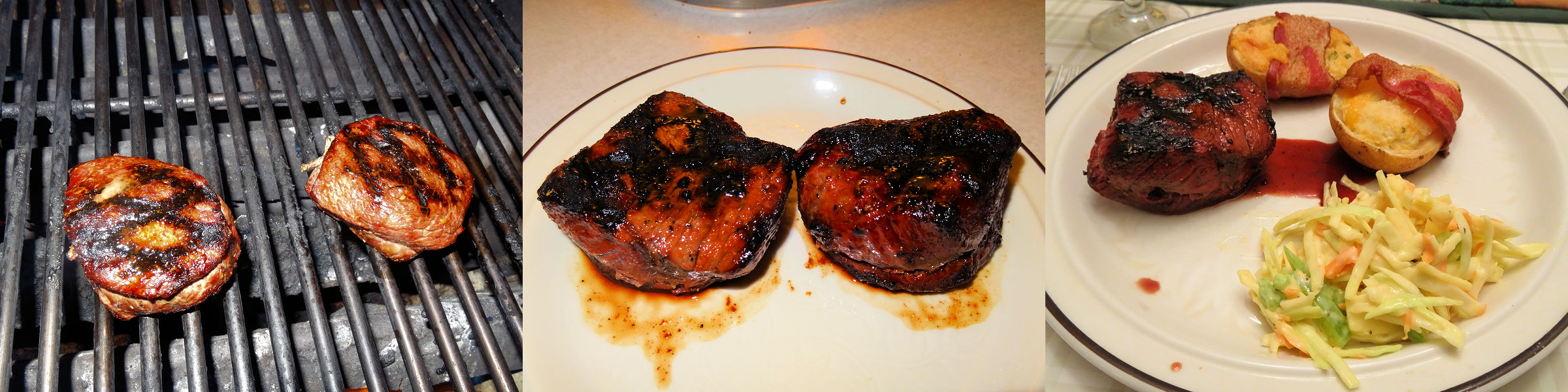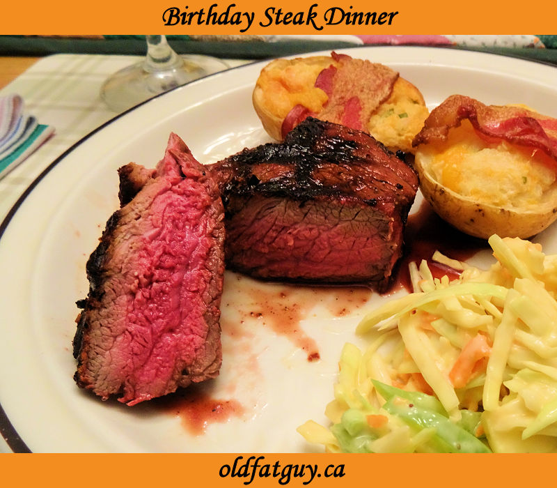 The sides were mushrooms and onions, She Who Must Be Obeyed’s great coleslaw and Bacon Wrapped Stuffed Potatoes.