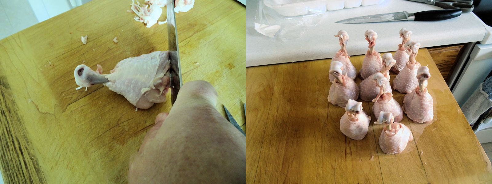 I started with 10 chicken drumsticks. I used a sharp knife to cut around the skin just where the drumstick starts to thicken. Then cut through the ligaments and meat with poultry shears.