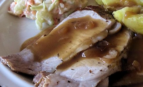 The problem with pork loins are they are quite lean and can tend to be a little dry and flavourless. I get around this by braising the pork loin instead of baking it. By simmering it in a flavourful broth, the pork picks up more flavour, is less dry and you end up with great gravy. Bonus!