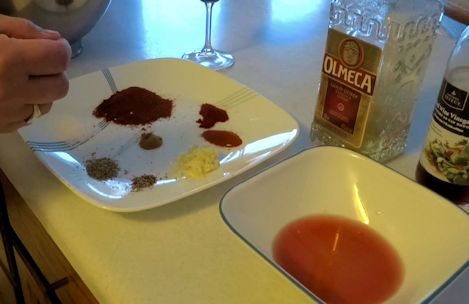 I put the pork in the fridge to keep cold and mixed the seasonings into the tequila and wine vinegar.