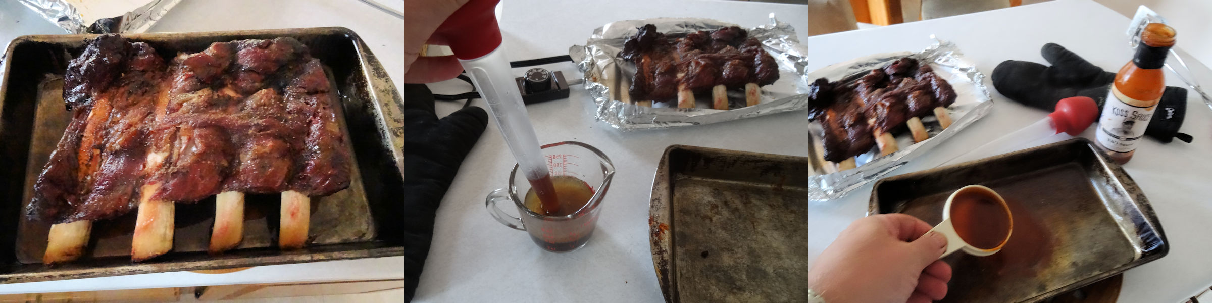 I took the ribs in and poured the liquid in the pan into a measuring cup. I defatted the liquid by pulling it out from under the fat with a turkey baster.
