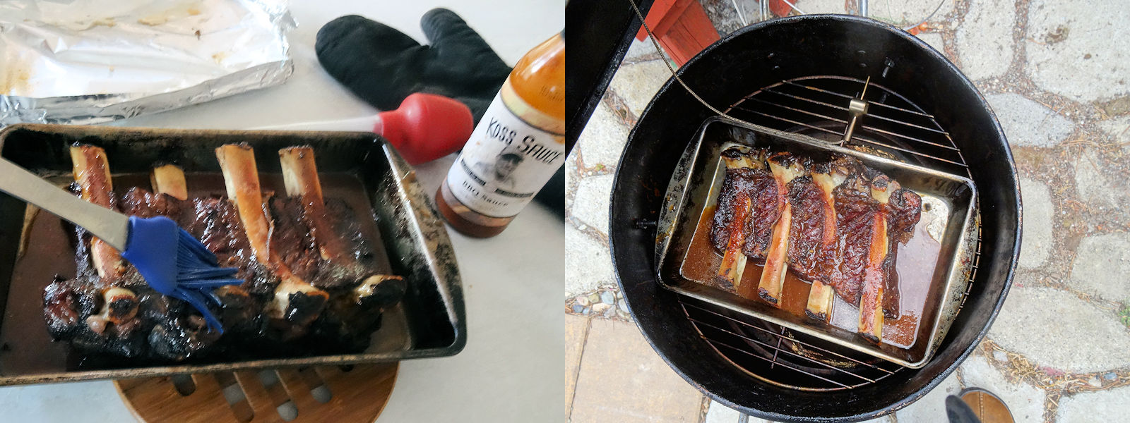 I put the ribs in the pan and brushed them with the sauce mixture. I put the pan, uncovered, back in the smoker for 1 1/2 hours, turning and brushing twice.
