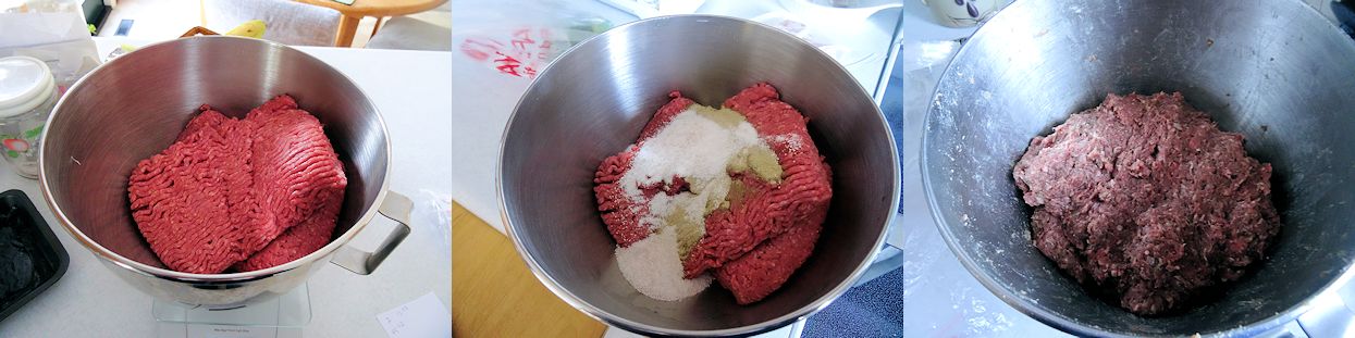 While it was chilling, I mixed 2 1/2 pounds of extra lean ground beef, 1/2 the seasoning packet, 1/2 of the cure packet and 1/4 cup of cold water. I mixed it thoroughly by hand for 4 minutes.