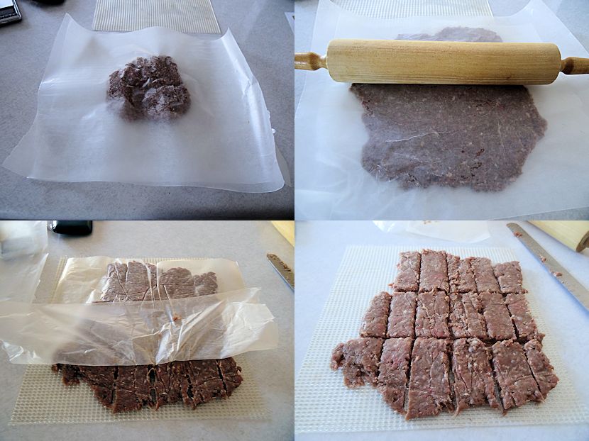 I put 1/4 of the beef on a sheet of wax paper and covered it with another sheet of wax paper. I used a rolling pin to roll it out to about 1/4 inch thick. I removed the top piece of wax paper and cut it into serving size pieces. I put the rack of my dehydrator on the beef and turned it all over. I peeled the last of the wax paper off. I repeated for the remaining ground beef.