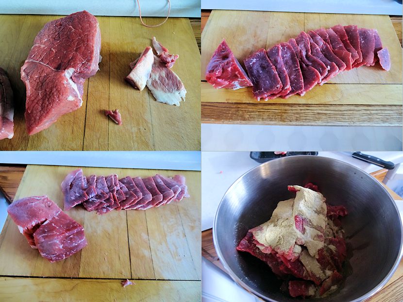 While the ground beef jerky was drying, I sliced the chilled bottom round to about 1/8 inch thick. I mixed it thoroughly with the remaining cure, seasonings and 1/4 cup water. I put the beef in the fridge overnight to cure.