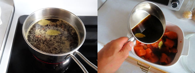 - Mix the marinade ingredients together in a small saucepan. Heat until sugar is dissolved. Cool.
