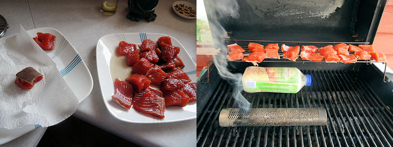 I rinsed the salmon under cold water and dried it with paper towels. I put my A-Maze-N Tube Smoker into my Weber Genesis Grill. I did not turn the grill on and put a container of ice I had frozen in a plastic bottle in the grill. I closed the lid. This allowed me to cold smoke the salmon for 6 hours. If you do not have some form of smoke generator, you can skip this step. I just like quite a strong smoke flavour in my candied salmon.