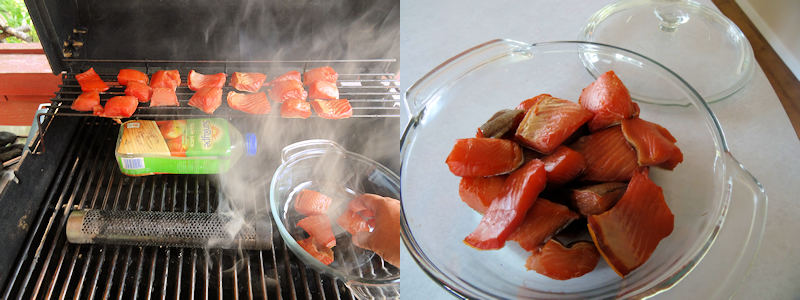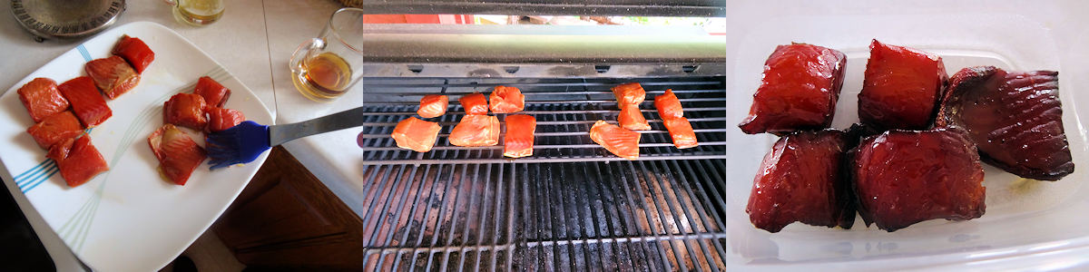 I smoked for about four hours, brushing with the maple syrup or honey mixture every 1/2 hour, to get the internal temperature of the salmon to 140 F.