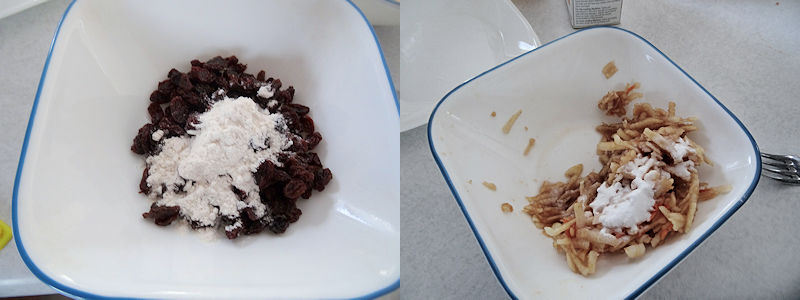Toss the raisins in the reserved flour. Blend the raisins, carrots and half the apples into the batter.