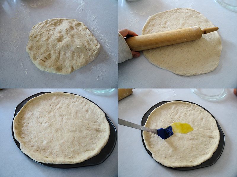 Press the dough into a disc and then stretch or roll it to the size of a 14 inch pizza pan. Spray the pizza pan with baking spray and put the dough on it. Pinch up the edge of the dough to make a raised rim. Brush the dough with olive oil.
