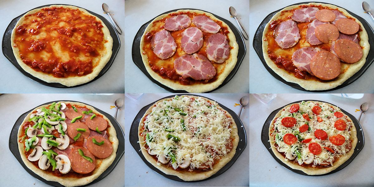 Spread the pizza sauce around the crust and add your favourite toppings. You can put different toppings on each half of the pizza to suit differing tastes.