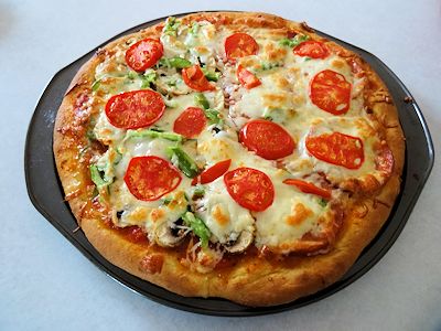 Cover the toppings with shredded mozzarella cheese. If you have fresh tomatoes, they make a great topping on a pizza. Put them on top of the cheese and the heat makes them dry out a bit and gives them an intense tomato taste.