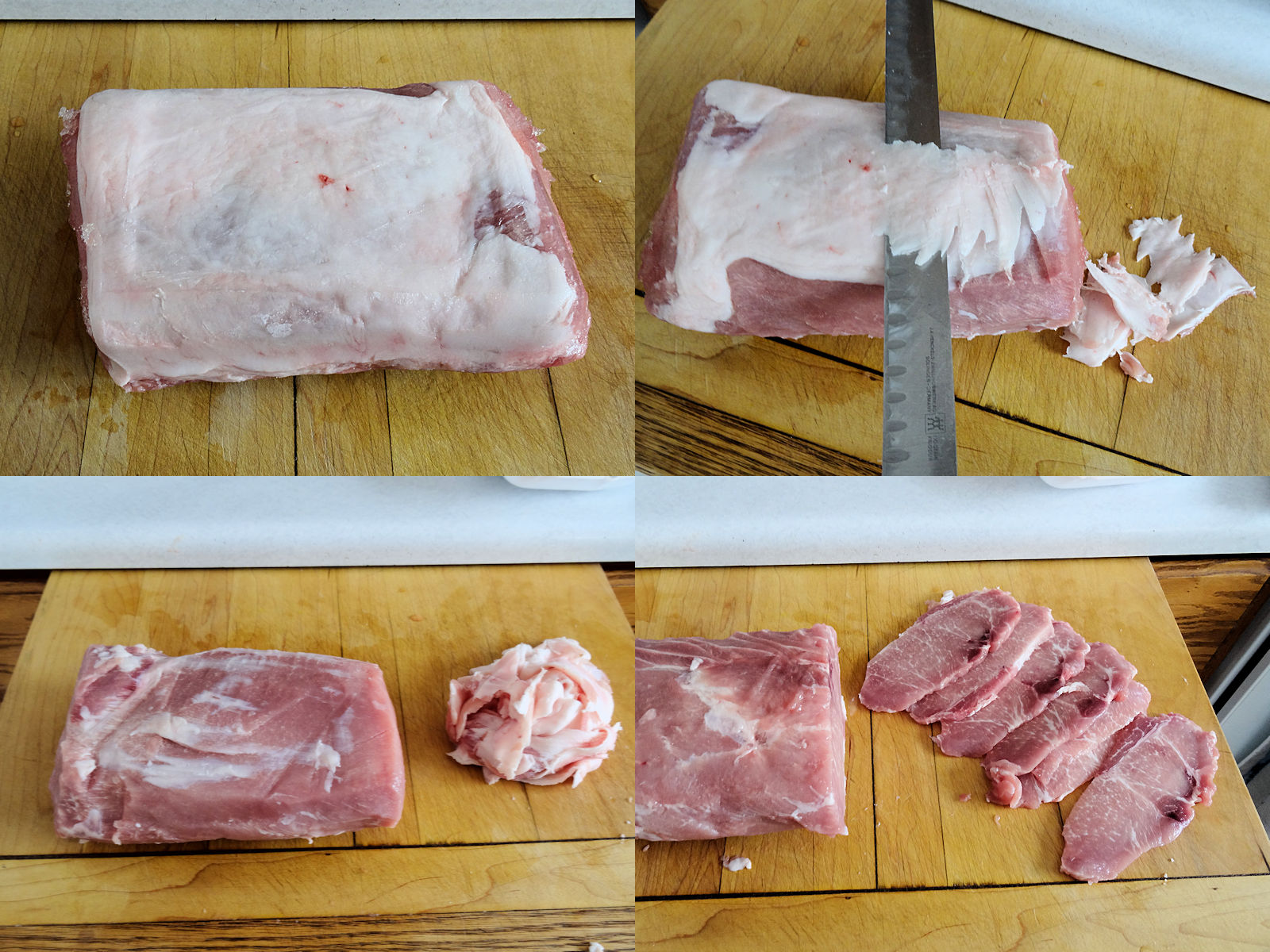 I started with a pork loin. You want to find the leanest piece of pork you can. Trim off any surface fat and slice the pork into ¼ inch (6 mm) thick slices. I like to do this when the pork is slightly frozen, but a good slicing knife can do the job even on a thawed pork loin.