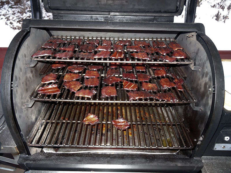 7. Cook in a 200 F (95 C) smoker or oven until leathery but not dry, about 2 hours. The surface should crack on bending but not break.