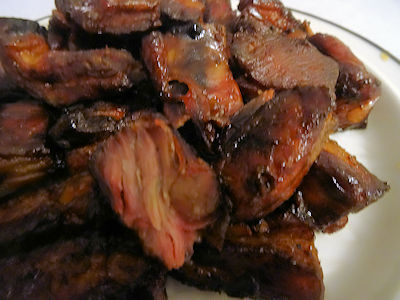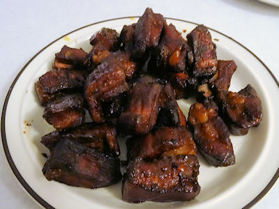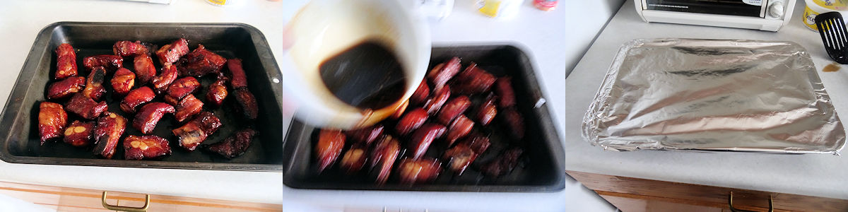 Because I cut the trimmings into smaller pieces, they had more surface area which let more fat cook out. The time in the moist heat under foil cooked out even more fat (you’ll be amazed how much fat is in the roasting pan). The last hour with the meat coated with the sweet char siu sauce caramelizes the surface and give the ribs a nice bite.
