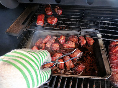 Take the ribs off the grill or rack and put them in a roasting pan. Pour the reserved marinade over them and toss to coat. Cover the pan tightly with foil and put back on the grill or in the oven for 2 hours.