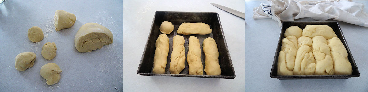 - Cut the dough into 16 pieces. Using three pieces each, form 5 long buns with one small bun left over.