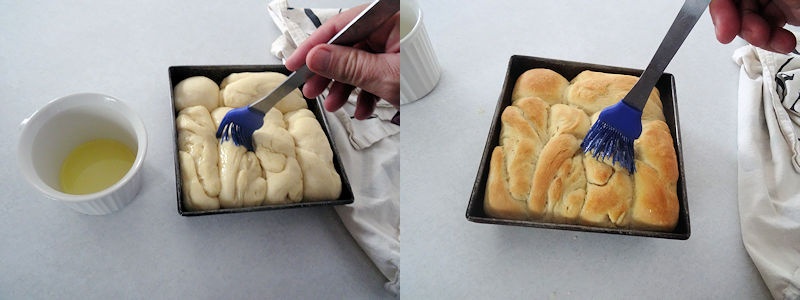 Brush the buns with melted butter and bake for about 18 to 22 minutes or until golden brown and the internal temperature is over 200 F. Remove from the oven and brush with melted butter.
