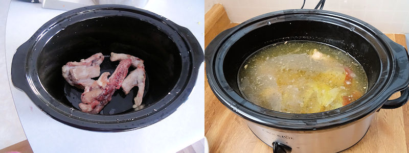 - Put the skin and bones from the chicken in the slow cooker and cook on low for 18 hours.
